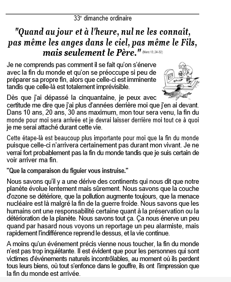 En ce temps-là, Jésus parlait à ses disciples de sa venue : « En ces jours-là, après une grande détresse, le soleil s’obscurcira et la lune ne donnera plus sa clarté ; les étoiles tomberont du ciel, et les puissances célestes seront ébranlées. Alors on verra le Fils de l’homme venir dans les nuées avec grande puissance et avec gloire. Il enverra les anges pour rassembler les élus des quatre coins du monde, depuis l’extrémité de la terre jusqu’à l’extrémité du ciel. Laissez-vous instruire par la comparaison du figuier : dès que ses branches deviennent tendres et que sortent les feuilles, vous savez que l’été est proche. De même, vous aussi, lorsque vous verrez arriver cela, sachez que le Fils de l’homme est proche, à votre porte. Amen, je vous le dis : cette génération ne passera pas avant que tout cela n’arrive. Le ciel et la terre passeront, mes paroles ne passeront pas. Quant à ce jour et à cette heure-là, nul ne les connaît, pas même les anges dans le ciel, pas même le Fils, mais seulement le Père. »