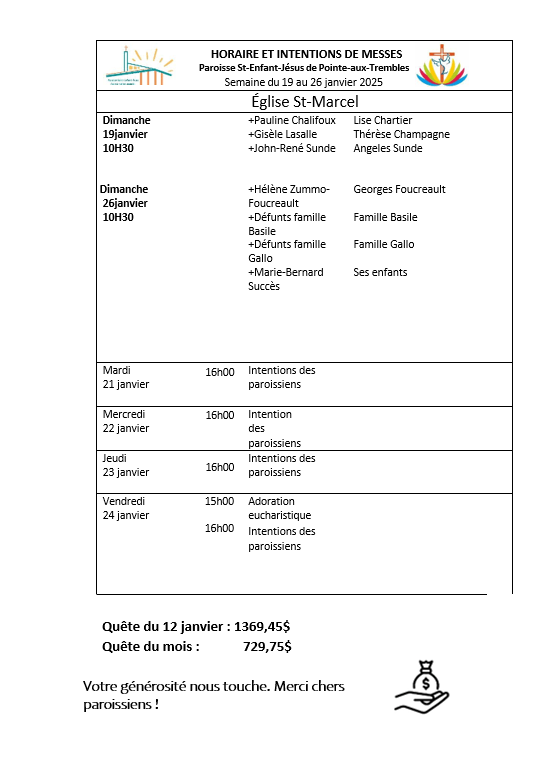 Joyeux anniversaire à tous nos frères et sœurs de la paroisse qui célèbrent leur anniversaire de naissance ou de mariage durant le mois de janvier 2025. Nous vous assurons de notre prière fraternelle.