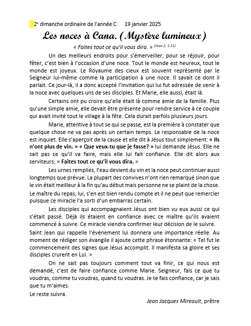 En ce temps-là, il y eut un mariage à Cana de Galilée. La mère de Jésus était là. Jésus aussi avait été invité au mariage avec ses disciples.