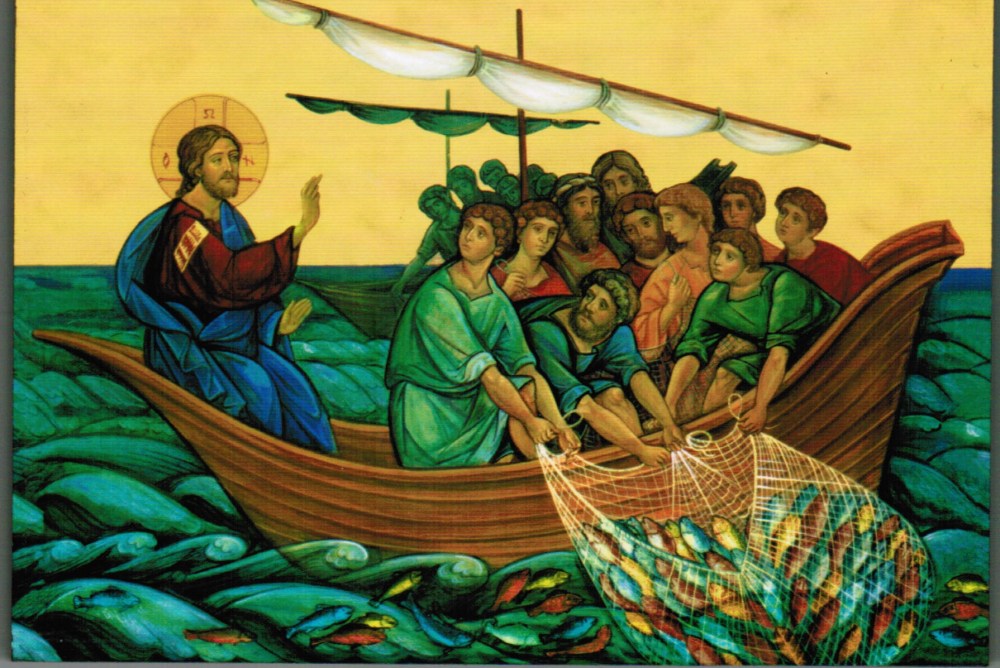 Quand il eut fini de parler, il dit à Simon : « Avance au large, et jetez vos filets pour la pêche. » Simon lui répondit : « Maître, nous avons peiné toute la nuit sans rien prendre ; mais, sur ta parole, je vais jeter les filets. » Et l’ayant fait, ils capturèrent une telle quantité de poissons que leurs filets allaient se déchirer. Ils firent signe à leurs compagnons de l’autre barque de venir les aider. Ceux-ci vinrent, et ils remplirent les deux barques, à tel point qu’elles enfonçaient. À cette vue, Simon-Pierre tomba aux genoux de Jésus, en disant : « Éloigne-toi de moi, Seigneur, car je suis un homme pécheur. » En effet, un grand effroi l’avait saisi, lui et tous ceux qui étaient avec lui, devant la quantité de poissons qu’ils avaient pêchés ; et de même Jacques et Jean, fils de Zébédée, les associés de Simon. Jésus dit à Simon : « Sois sans crainte, désormais ce sont des hommes que tu prendras. » Alors ils ramenèrent les barques au rivage et, laissant tout, ils le suivirent.