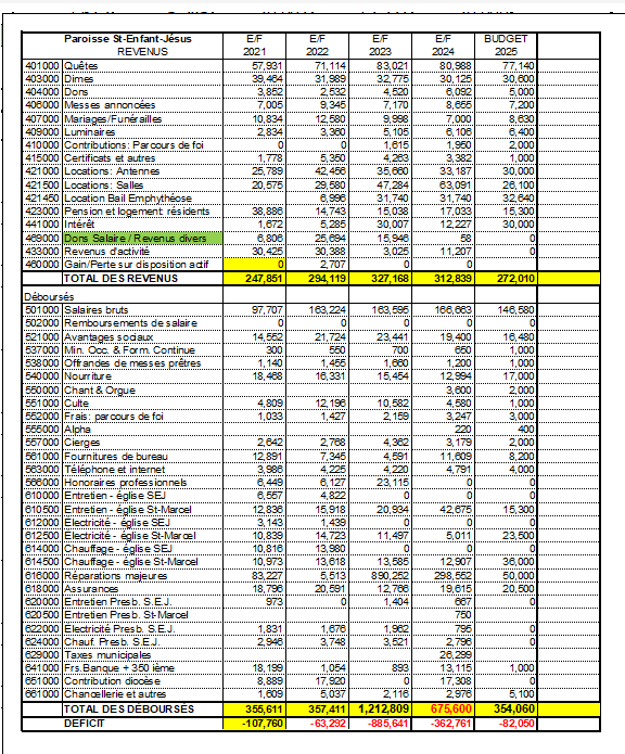 N.B. Si vous voulez avoir des informations additionnelles concernant les Finances de la Fabrique de la Paroisse, n’hésitez pas à communiquer avec Roland Demers, trésorier non marguillier: