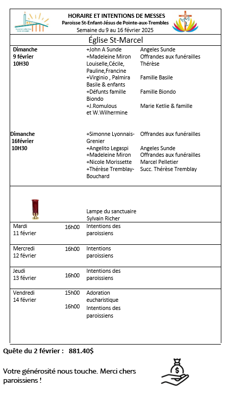 et sur le site web de la Paroisse Saint-Enfant-Jésus, PAROISSESEJ.COM, entrez votre courriel – pour recevoir des alertes de nouvelle chaque semaine.