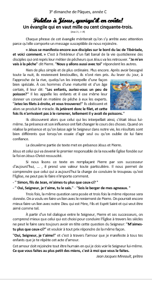 Quand ils eurent mangé, Jésus dit à Simon-Pierre : « Simon, fils de Jean, m’aimes-tu vraiment, plus que ceux-ci ? » Il lui répond : « Oui, Seigneur ! Toi, tu le sais : je t’aime. » Jésus lui dit : « Sois le berger de mes agneaux. » Il lui dit une deuxième fois : « Simon, fils de Jean, m’aimes-tu vraiment ? » Il lui répond : « Oui, Seigneur ! Toi, tu le sais : je t’aime. » Jésus lui dit : « Sois le pasteur de mes brebis. » Il lui dit, pour la troisième fois : « Simon, fils de Jean, m’aimes-tu ? » Pierre fut peiné parce que, la troisième fois, Jésus lui demandait : « M’aimes-tu ? » Il lui répond : « Seigneur, toi, tu sais tout : tu sais bien que je t’aime. » Jésus lui dit : « Sois le berger de mes brebis. Amen, amen, je te le dis : quand tu étais jeune, tu mettais ta ceinture toi-même pour aller là où tu voulais ; quand tu seras vieux, tu étendras les mains, et c’est un autre qui te mettra ta ceinture, pour t’emmener là où tu ne voudrais pas aller. » Jésus disait cela pour signifier par quel genre de mort Pierre rendrait gloire à Dieu. Sur ces mots, il lui dit : « Suis-moi. »