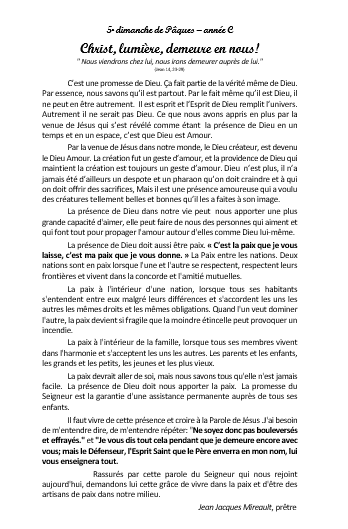 Je vous laisse la paix, je vous donne ma paix ; ce n’est pas à la manière du monde que je vous la donne. Que votre cœur ne soit pas bouleversé ni effrayé. Vous avez entendu ce que je vous ai dit : Je m’en vais, et je reviens vers vous. Si vous m’aimiez, vous seriez dans la joie puisque je pars vers le Père, car le Père est plus grand que moi. Je vous ai dit ces choses maintenant, avant qu’elles n’arrivent ; ainsi, lorsqu’elles arriveront, vous croirez. »