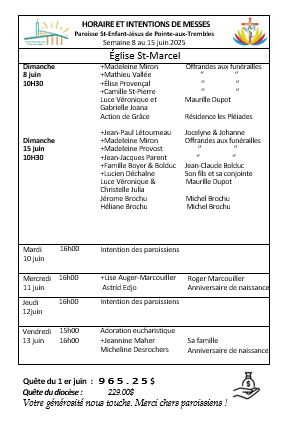 Suivez-nous: sur Facebook: Les amis de l’église Saint-Marcel, et www.paroissesej.com, le site web de la Paroisse Saint-Enfant-Jésus de Pointe-aux-Trembles. Partagez votre courriel pour recevoir de nouvelle chaque semaine.