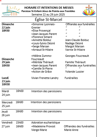 Suivez-nous: sur Facebook: Les amis de l’église Saint-Marcel, et www.paroissesej.com, le site web de la Paroisse Saint-Enfant-Jésus de Pointe-aux-Trembles. Partagez votre courriel pour recevoir de nouvelle chaque semaine.