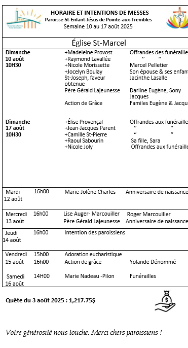 Suivez-nous: sur Facebook: Les amis de l’église Saint-Marcel, et www.paroissesej.com, le site web de la Paroisse Saint-Enfant-Jésus de Pointe-aux-Trembles. Partagez votre courriel pour recevoir de nouvelle chaque semaine.