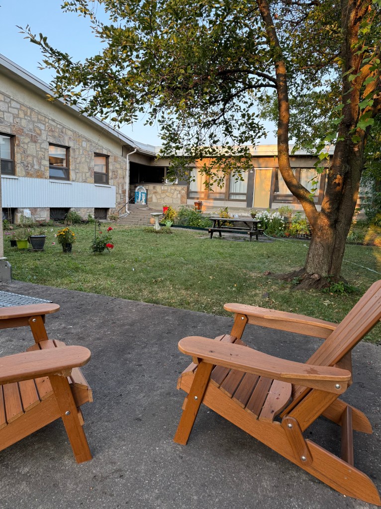 - Chaises, tables rectangulaires, réfrigérateur, four micro-onde