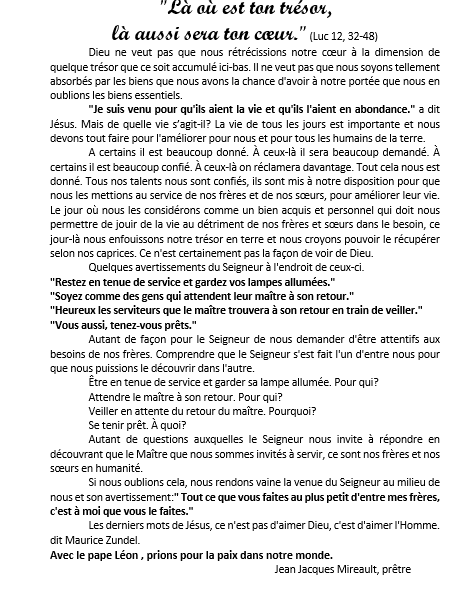 Aujourd’hui, Jésus dit à ses disciples : « Sois sans crainte, petit troupeau, votre Père a trouvé bon de vous donner le Royaume. Vendez ce que vous possédez et donnez-le en aumône. » Cette parole de Jésus est à mon avis comme une réponse à l’homme riche de dimanche dernier. En d’autres termes, Jésus lui dit : « Sois sans crainte cher ami (repose-toi, mange, boit), car le Royaume de Dieu (c’est-à-dire le bonheur éternel) ne s’achète pas puisqu’il est tout à fait gratuit. Donc, tu n’as pas besoin de faire des économies ni d’accumuler beaucoup de richesses pour obtenir le bonheur éternel puisqu’il est un DON D’AMOUR DE DIEU. »
