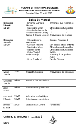 Suivez-nous: sur Facebook: Les amis de l’église Saint-Marcel, et www.paroissesej.com, le site web de la Paroisse Saint-Enfant-Jésus de Pointe-aux-Trembles. Partagez votre courriel pour recevoir de nouvelle chaque semaine.