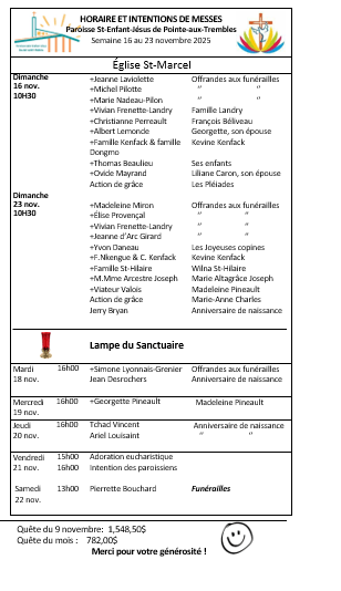 Si vous voulez avoir des informations additionnelles concernant les Finances de la Fabrique de la Paroisse, n’hésitez pas à communiquer avec : Roland Demers, trésorier non marguillier: Téléphone: 514-645-9822.