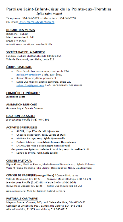Si vous voulez avoir des informations additionnelles concernant les Finances de la Fabrique de la Paroisse, n’hésitez pas à communiquer avec : Roland Demers, trésorier non marguillier: Téléphone: 514-645-9822.