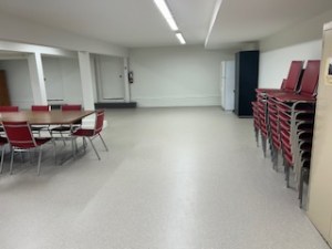 Chaises, tables rectangulaires, réfrigérateur, four micro-onde
